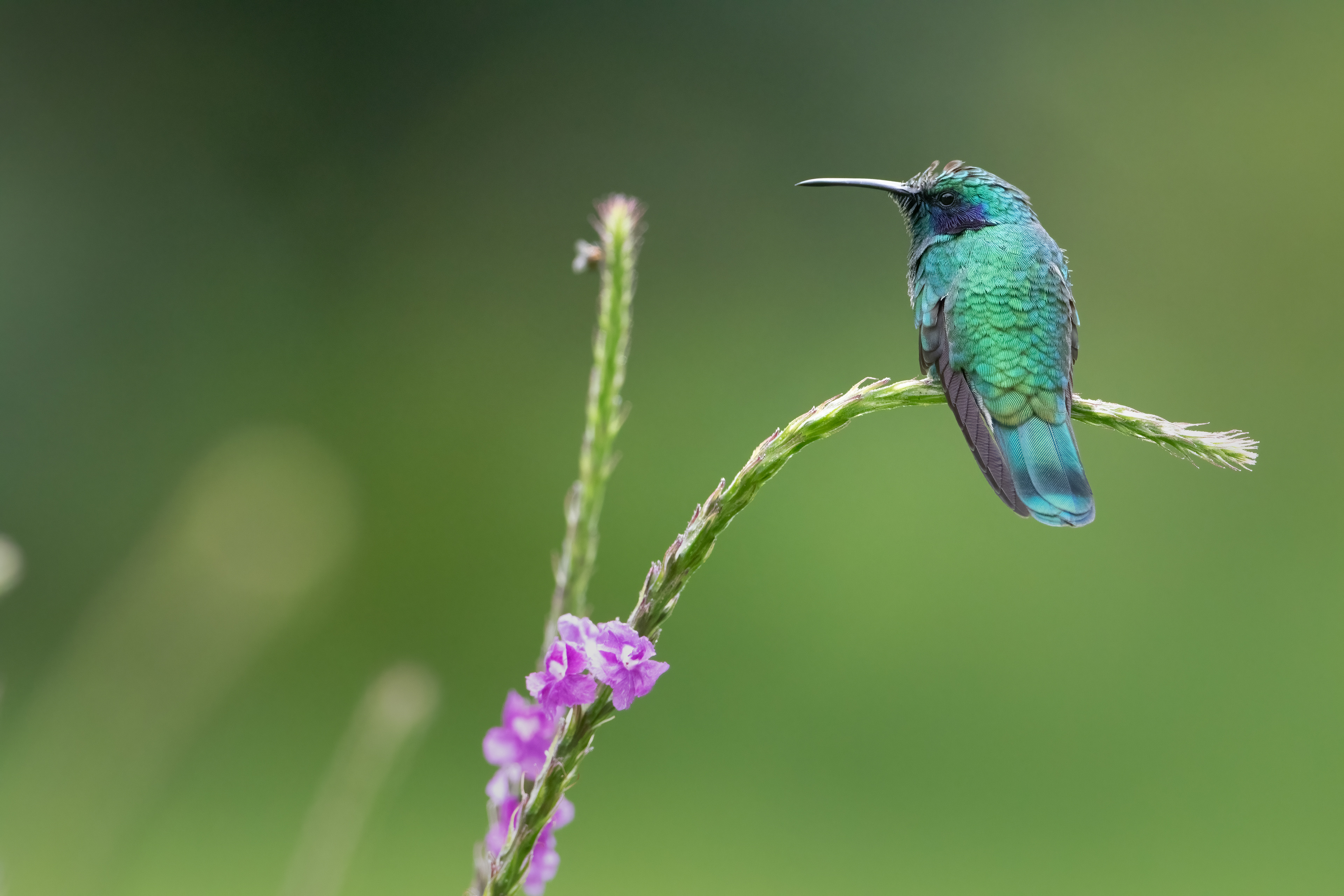 A Lesser Violetear perches on a thin stem allowing a nice framed shot with the 500 f4 prime, these magnificent hummingbirds are so vibrant they're impossible to miss.