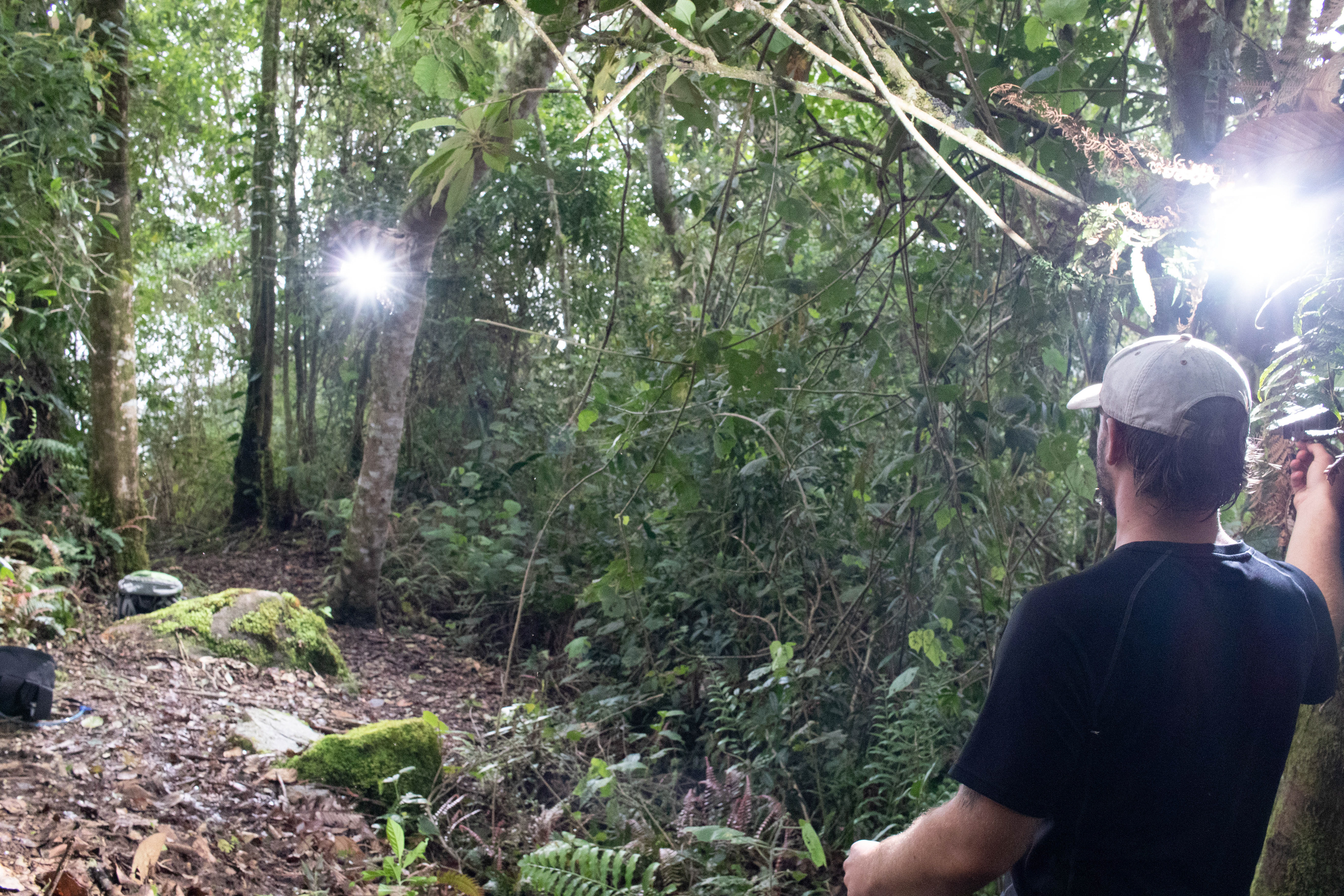 The set up consists of 1 DSLR camera and a 24mm lens and protective housing, 2 off-camera flashes connected via wireless triggers and a PIR sensor to detect infrared radiation of mammals passing by.