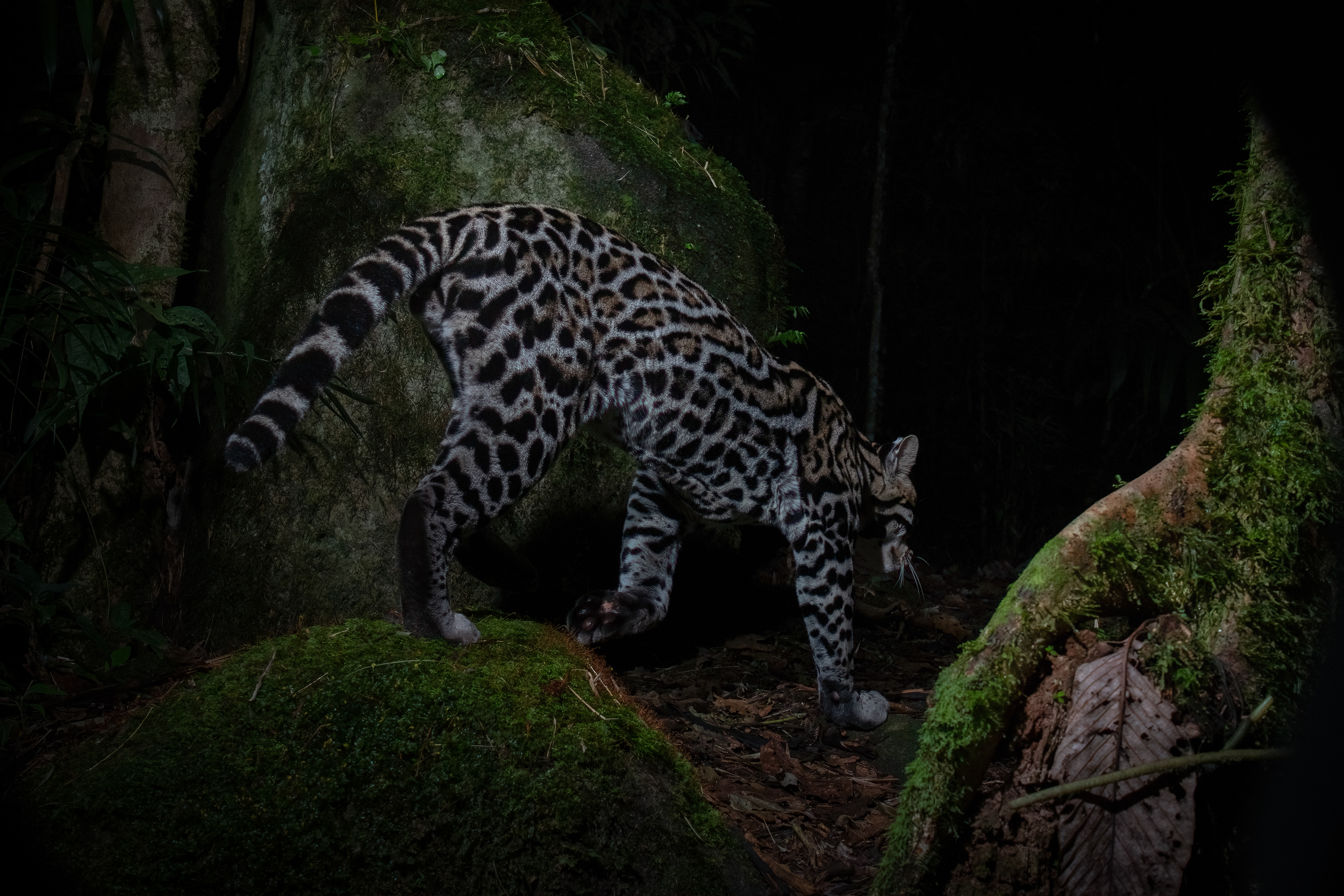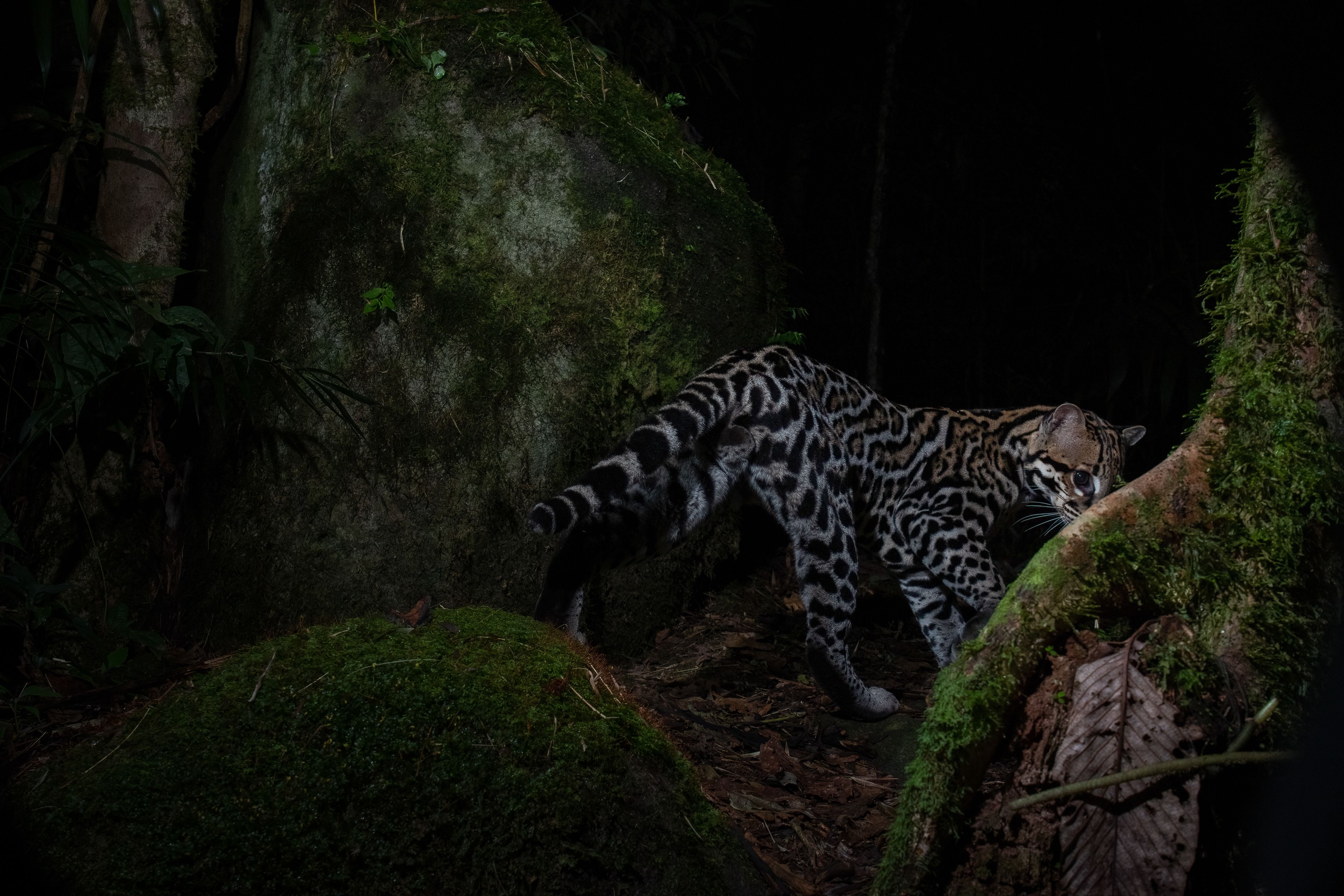 A melanistic oncilla passed my DSLR camera trap deep in primary forest. This is an incredibly rare capture and is in fact the first of its kind. I have not seen and cannot find any images of this species with the melanistic gene expressed, with a DSLR camera trap.