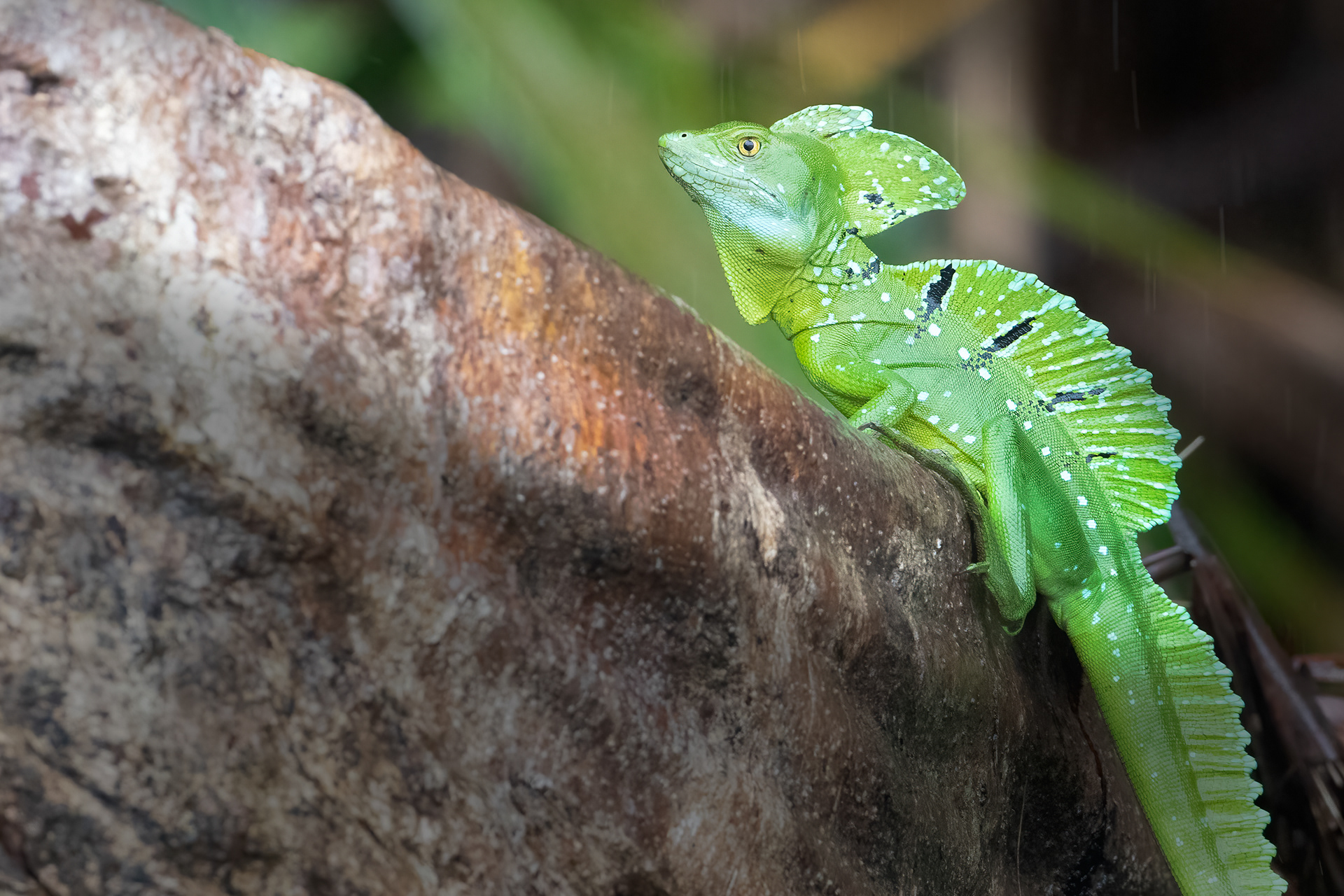A striking adult male Green Basalisk rests on a fallen tree spread over the surface of a canal. Basalisk's are well known as the "Jesus lizard" as they are capable of running on water.