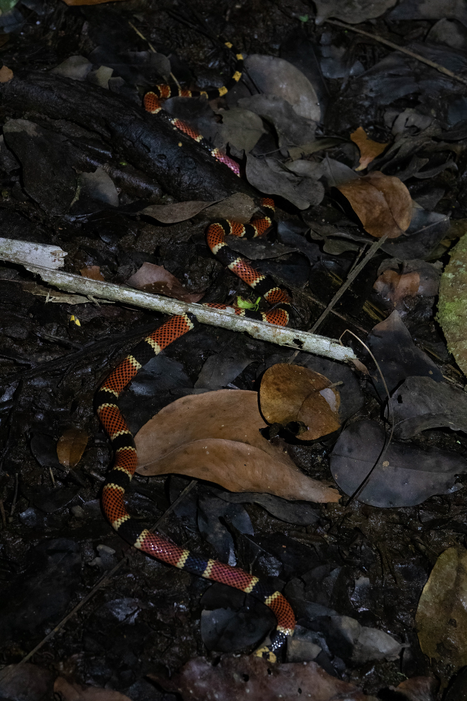 On a rainy night on a swamp trail in Tortuguero NP we came across a pool full of Tapir dung, looking to my right there was there Coral-snake. To Get this shot I practically had to crouch amongst the dung which filled the pool.